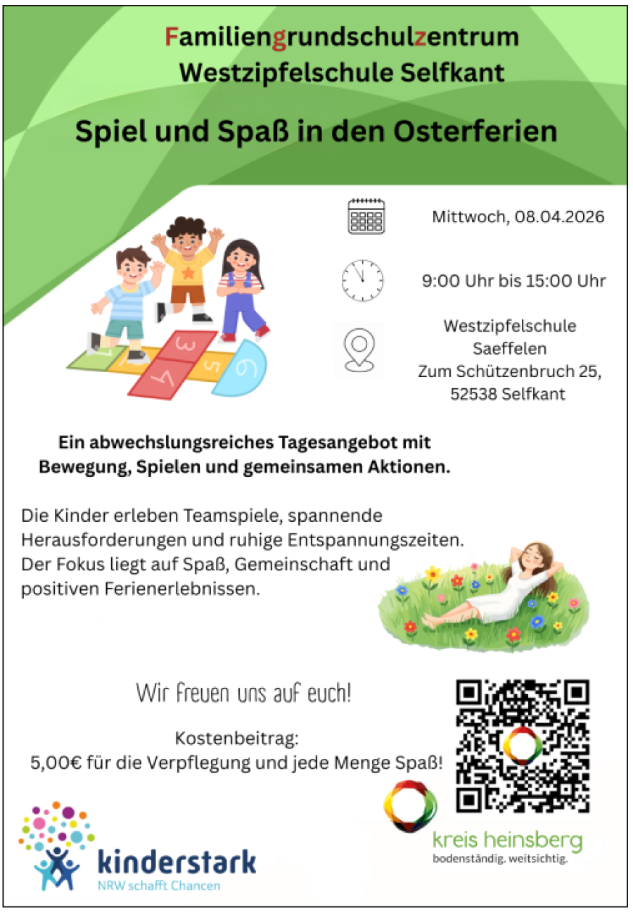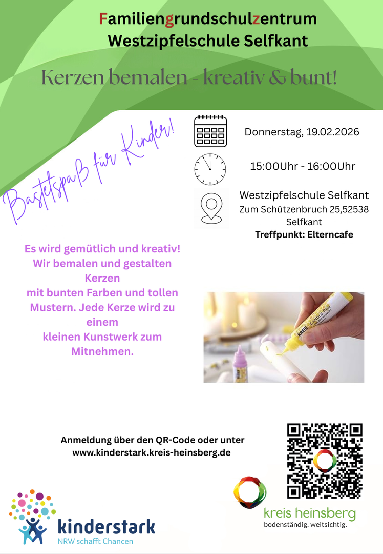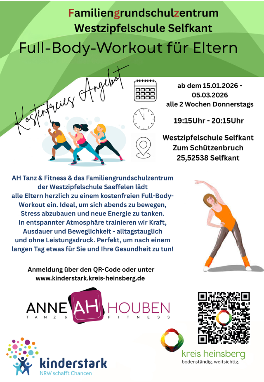 In Kooperation mit dem Kreisjugendamt Heinsberg hat die Gemeinde Selfkant an der Westzipfelschule im Oktober 2021 das erste Familiengrundschulzentrum im Kreis Heinsberg auf dem Weg gebracht! Melden sie sich gerne für unsere Angebote und Veranstaltungen an.