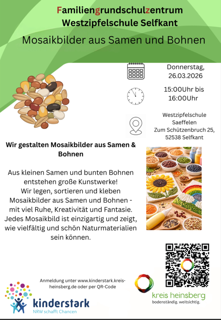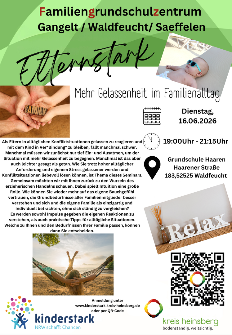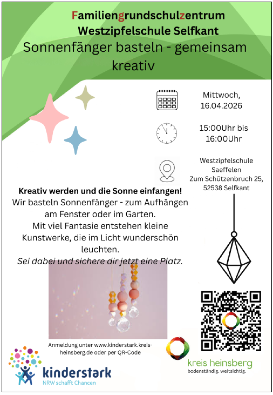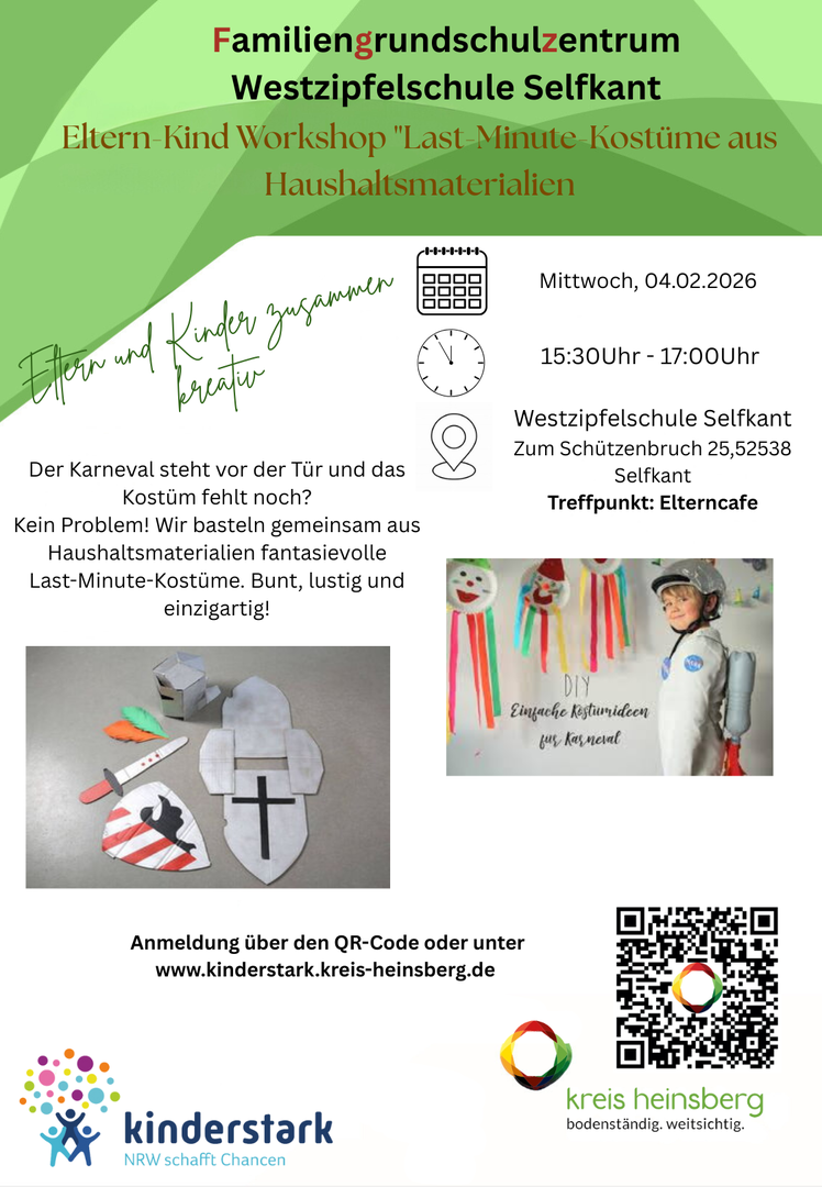 In Kooperation mit dem Kreisjugendamt Heinsberg hat die Gemeinde Selfkant an der Westzipfelschule im Oktober 2021 das erste Familiengrundschulzentrum im Kreis Heinsberg auf dem Weg gebracht! Melden sie sich gerne für unsere Angebote und Veranstaltungen an.